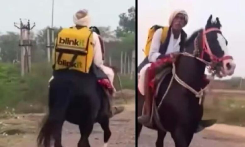‘रॉयल डिलीवरी’ का वीडियो वायरल, घोड़े पर सवार होकर ऑर्डर लेते दिखे Blinkit वाले अंकल