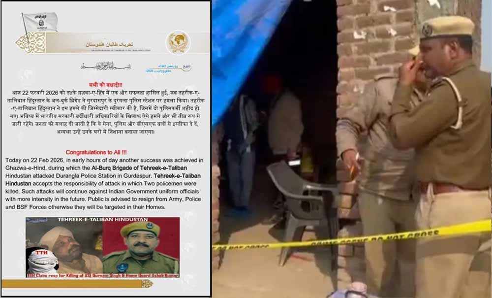 गांव आदियां में थाना दोरांगला के तहत चेक पोस्ट पर दो पुलिसकर्मियों की संदिग्ध रूप से गोली लगने से मौत के मामले में तहरीक-ए-तालिबान हिंदुस्तान ने घटना की जिम्मेदारी ली है। सोशल मीडिया पर वायरल पोस्ट में लिखा गया है कि आज 22 फरवरी 2026 को तड़के गजवा-ए-हिंद में एक और सफलता हासिल हुई, जब तहरीक-ए-तालिबान हिंदुस्तान के अल-बुर्क ब्रिगेड ने गुरदासपुर के दुरंगला पुलिस स्टेशन पर हमला किया।