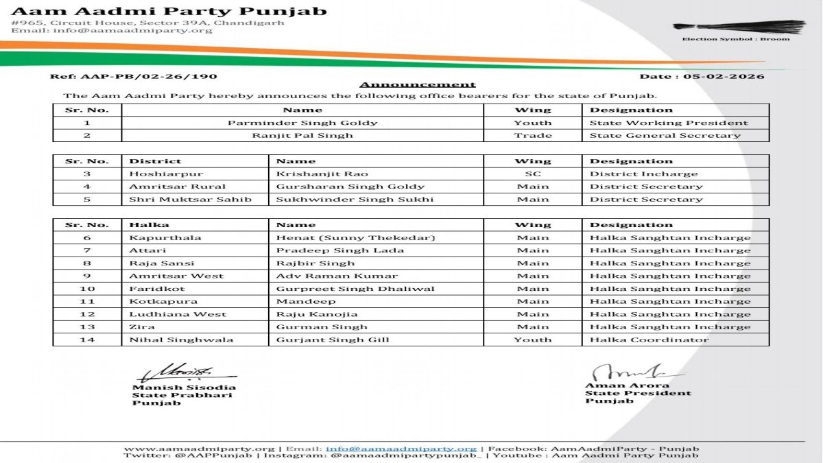 आप पंजाब द्वारा राज्य, ज़िला और क्षेत्र स्तर पर महत्वपूर्ण संगठनात्मक नियुक्तयों की घोषणा